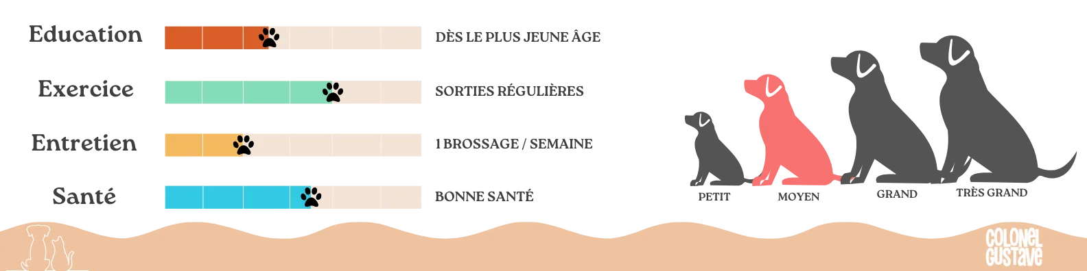 Concernant l’exercice, il a besoin de pouvoir se dépenser en plus des promenades quotidiennes. L’entretien de ses poils est facile et ne demande qu’un brossage par semaine. En revanche, en période de mue, un brossage quotidien est demandé.