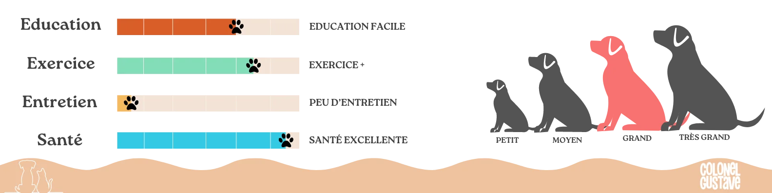 L’avantage de ses poils de couverture lisse et bien serré est qu’ils ne nécessitent qu’un brossage succinct. Comme la plupart des chiens, sa santé dépend avant tout de son alimentation. N’hésitez pas à lui donner des croquettes Colonel Gustave au plus vite pour éviter tout problème.